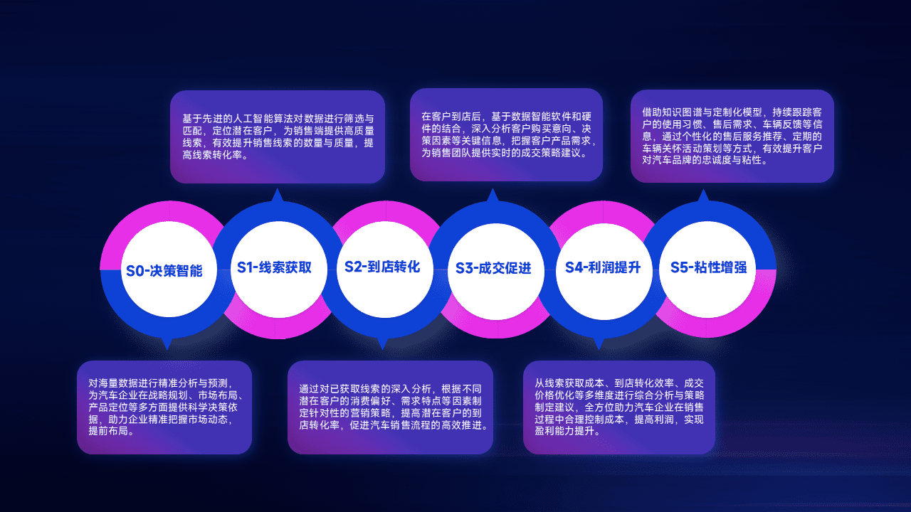 通过拓宽潜在客户来源、、优化线索分配并提高到店转化率,,,以增强销售效率。。同时,,,,利用线索数据不断优化分析模型,,,,有效提升转化率,,,,扩大营销影响力。。。